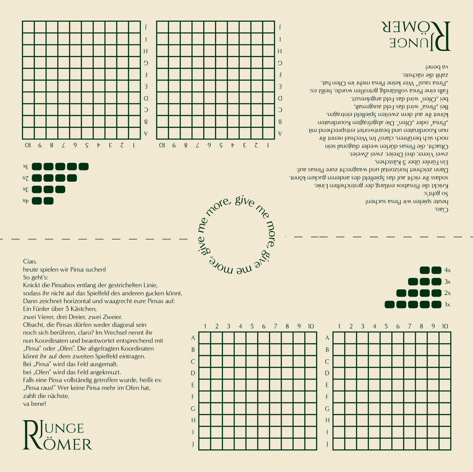 Sharing and connection were the driving forces behind this project for one of my favorite pinsa spots in Munich. I wanted to transform a simple takeaway box into something more meaningful, creating an experience that encourages interaction and memorable moments. The box features a reimagined version of the classic Battleship game, printed across its surface with a playful pinsa-inspired twist. I wrote simple, fun rules to make it easy for customers to dive right in. Each order came with two pens, inviting people to take their pinsa to go, enjoy it outdoors, and share both the food and the game with a friend.